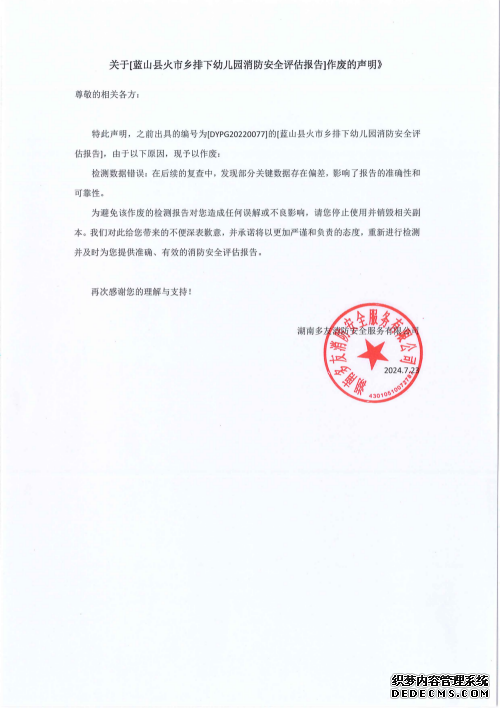 特此声明,之前出具的编号为【DYPG20220077】的【蓝山县火市乡排下幼儿园消防安全评估报告】,由于以下原因,现予以作废: